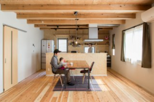 特徴 | 低炭素住宅認定/ 耐震等級3 / 県産材 無垢の総4寸柱使用 / 木造平屋建 |