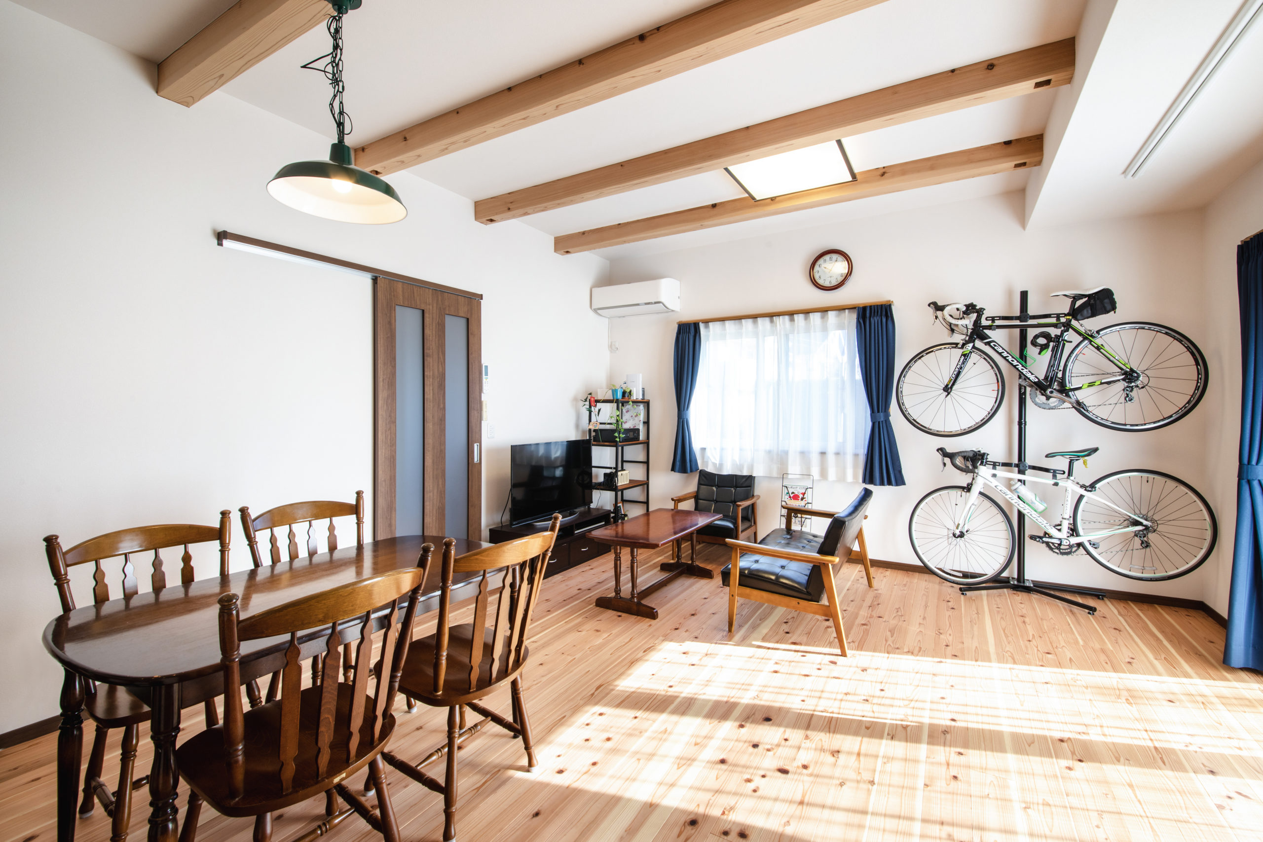 壁にはご家族の趣味である自転車を掛け、壁には天井の作り付けの本棚があるLDK。