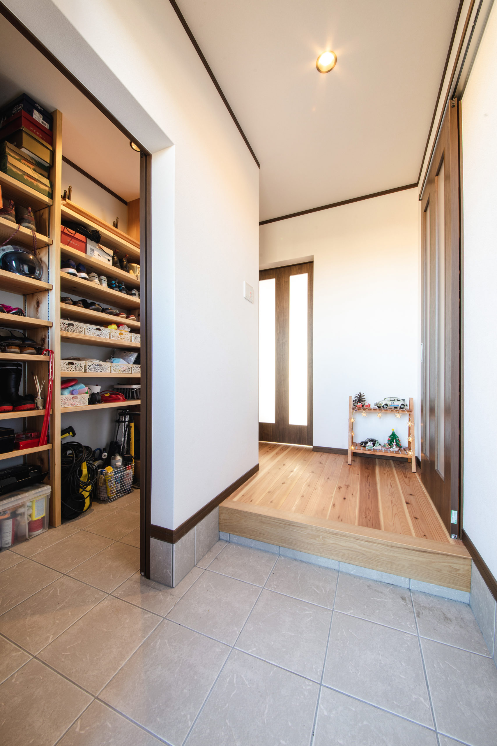 玄関はシューズクロークと玄関スペースを分け、玄関側からは建具で完全に目隠しすることが可能。