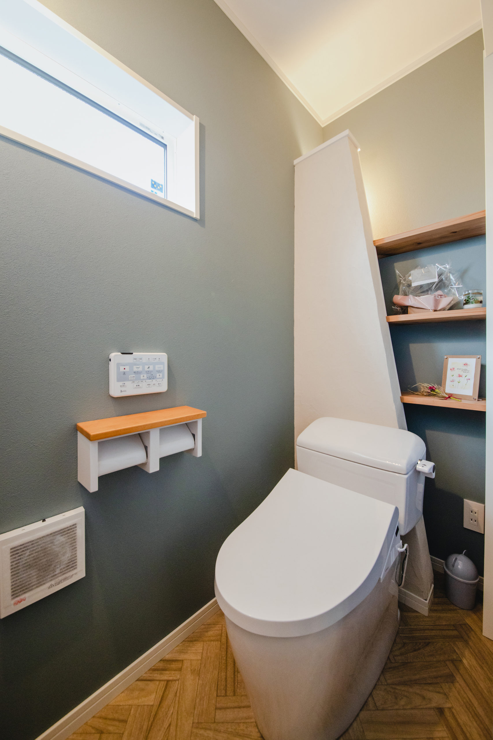 飾り棚は斜めに壁を作成することで、足元側に掃除道具を隠せるスペースを作っています。