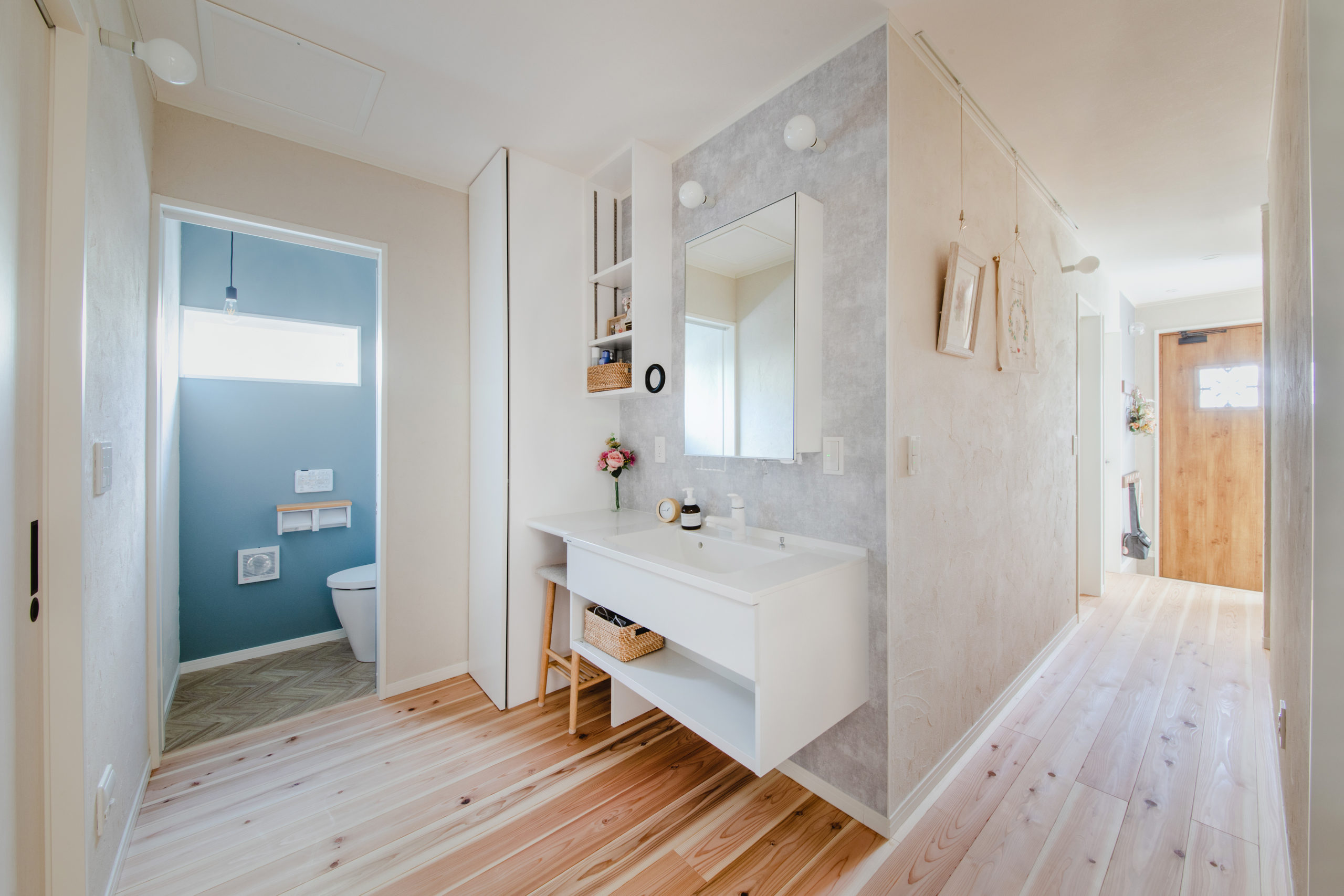 洗面空間は個室とせずに廊下の一角に作成することで、玄関からもトイレからもアクセスしやすい。