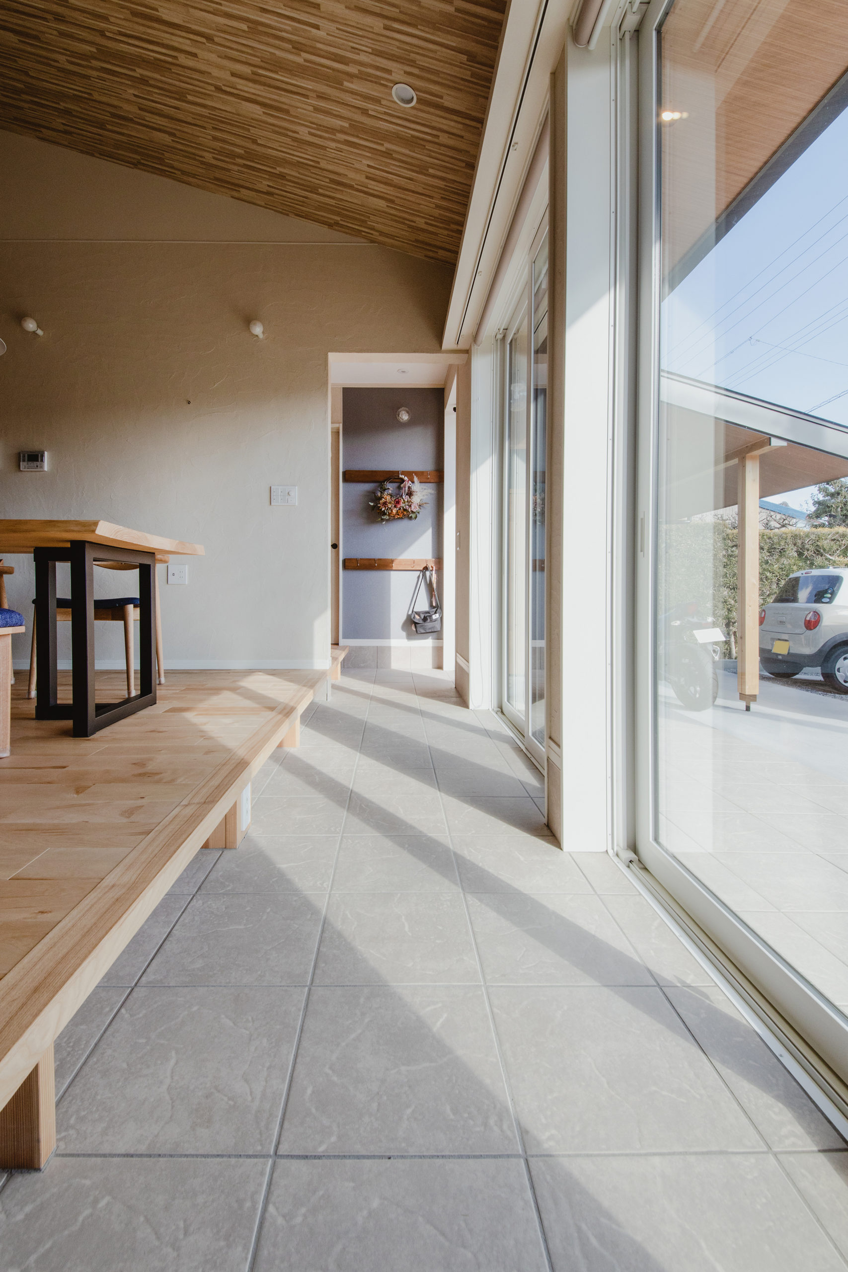 そのため、このタイルが貼られた室内土間は冬の昼間に太陽の暖かさを蓄えることを想定としており、蓄熱体としての役割も担っています。