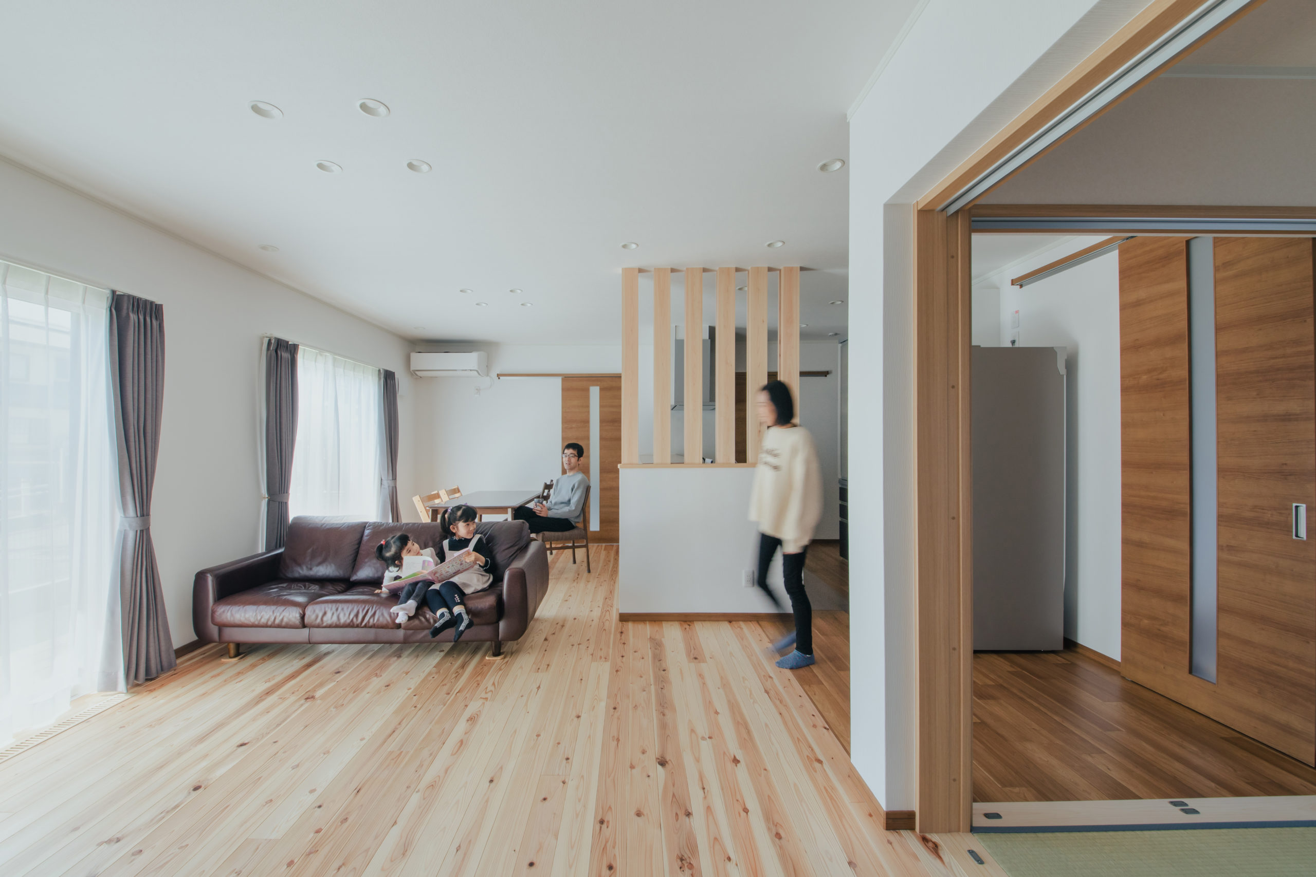冬の期間は、床下空間をエアコンで暖め、一階のそれぞれのお部屋に暖かい空気が床下から上がってくるシステムを採用しています。