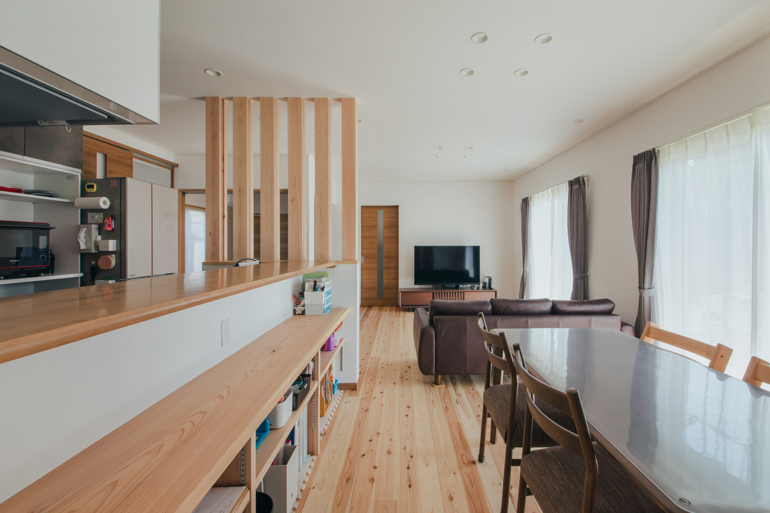 キッチンは柱のスリットでリビング側からは見えにくくなっています。