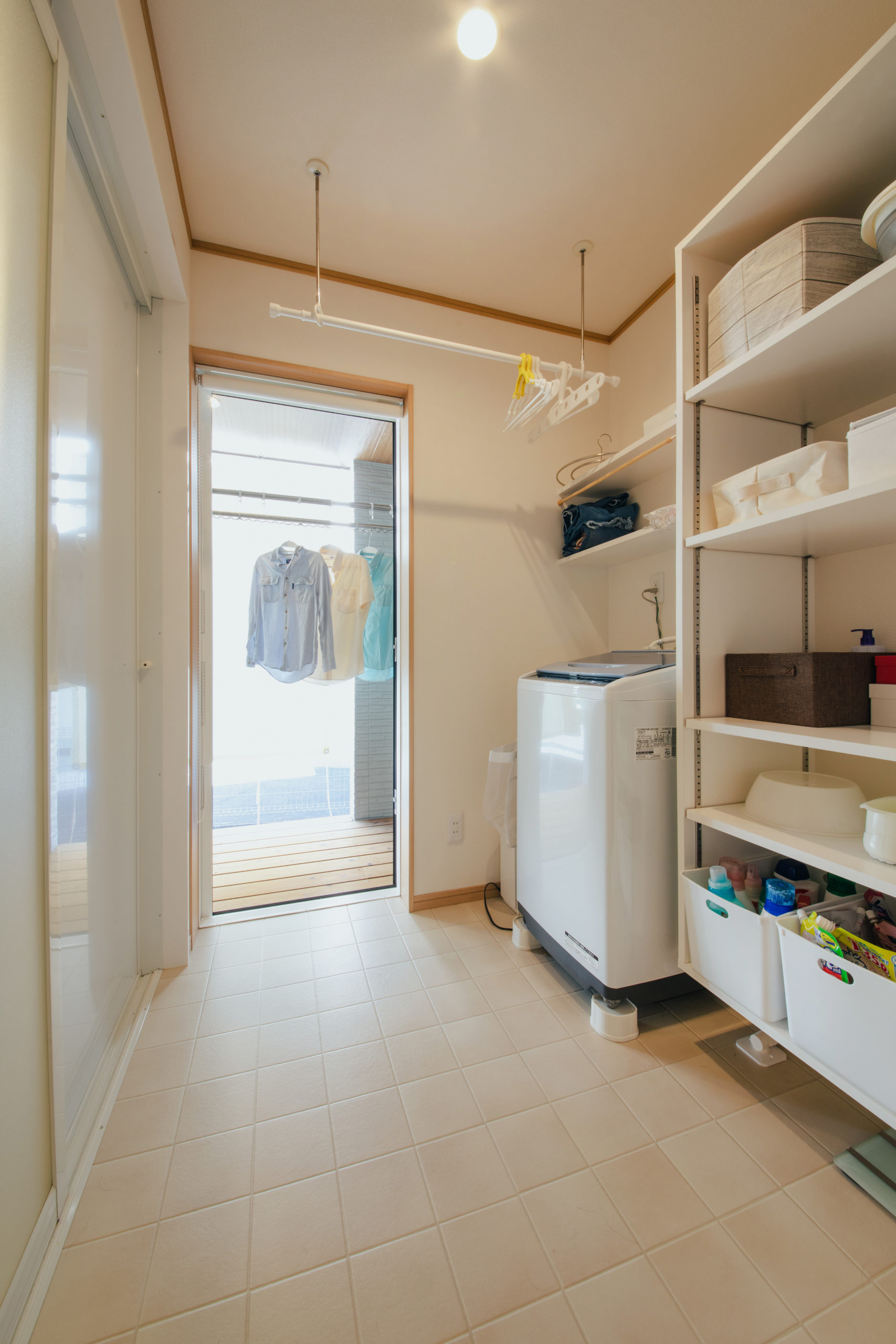 脱衣場からそのまま洗濯物スペースに出られるので、洗濯の家事動線が短くできました。