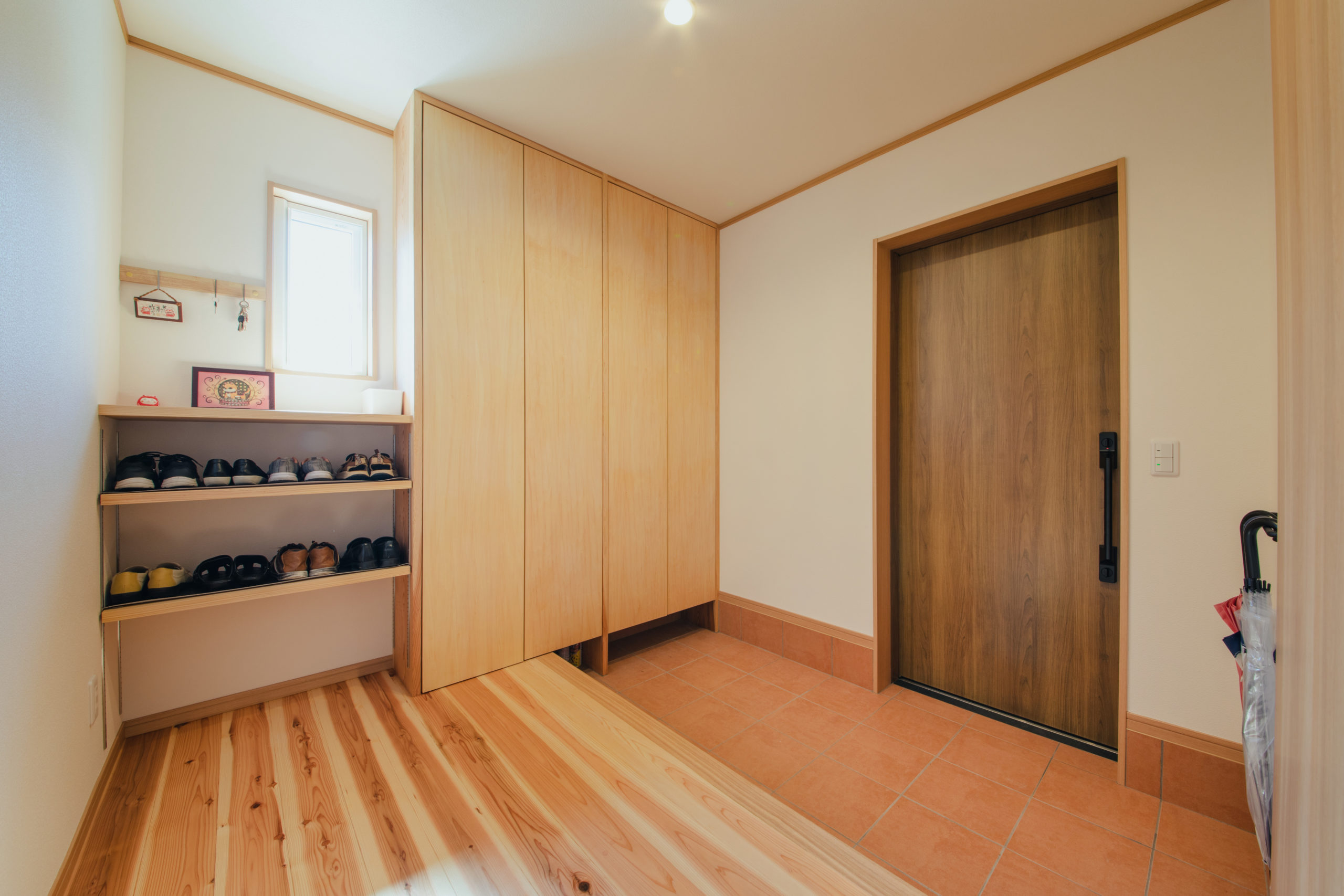 玄関は扉付きの造作収納棚と可動棚のある広々とした空間