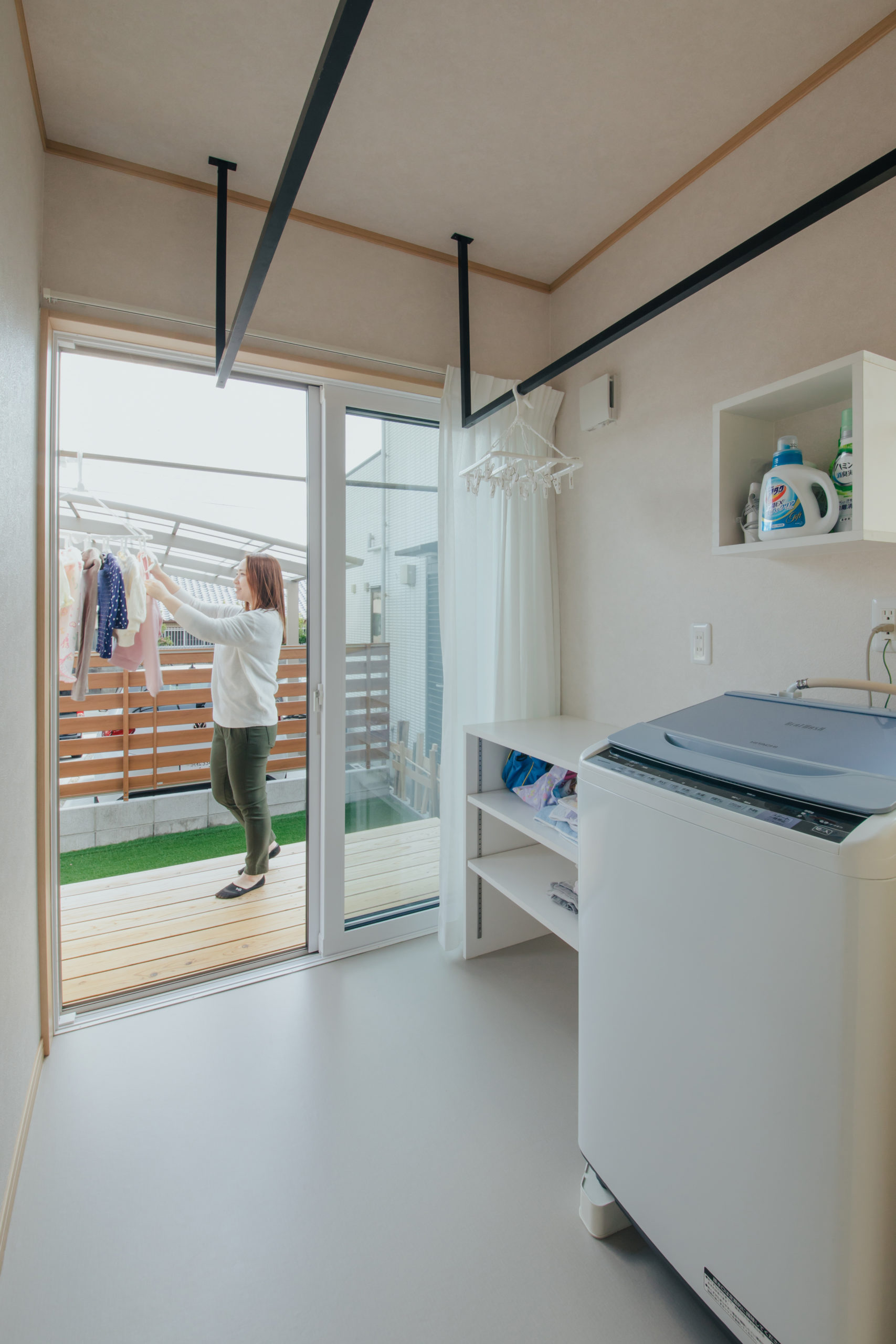 南側のウッドデッキに面した空間には、室内物干し+洗濯機置き場。
