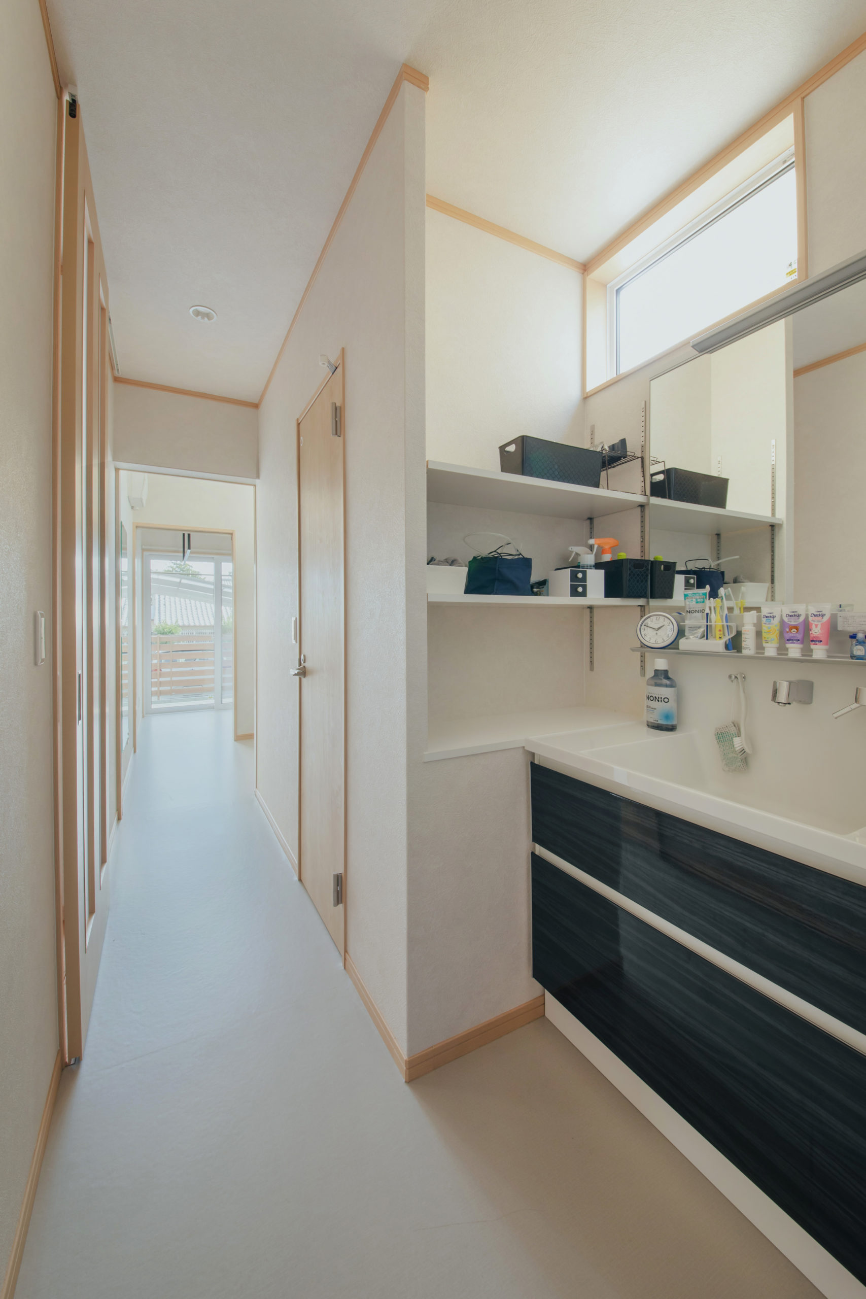 廊下に面した一部を洗面空間としたことで、お客様にも使いやすい位置に洗面台を設置できました。