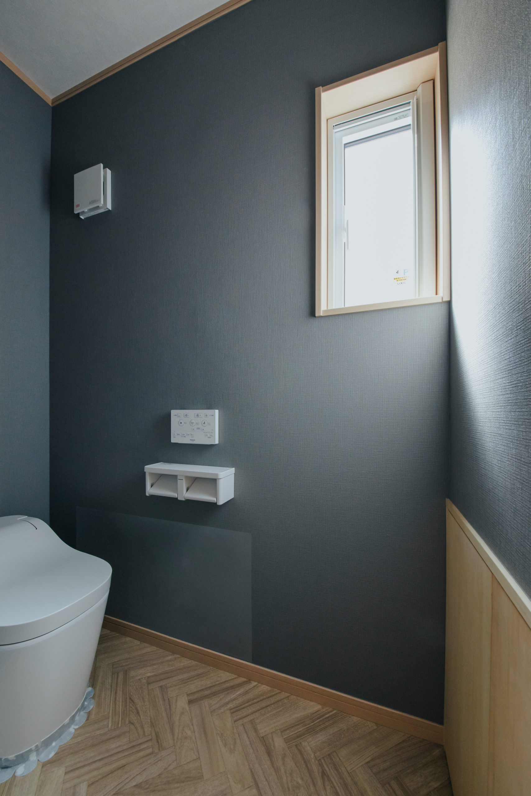 床のクッションフロアのヘリンボーン柄と相まって、カッコ良い空間となりました。