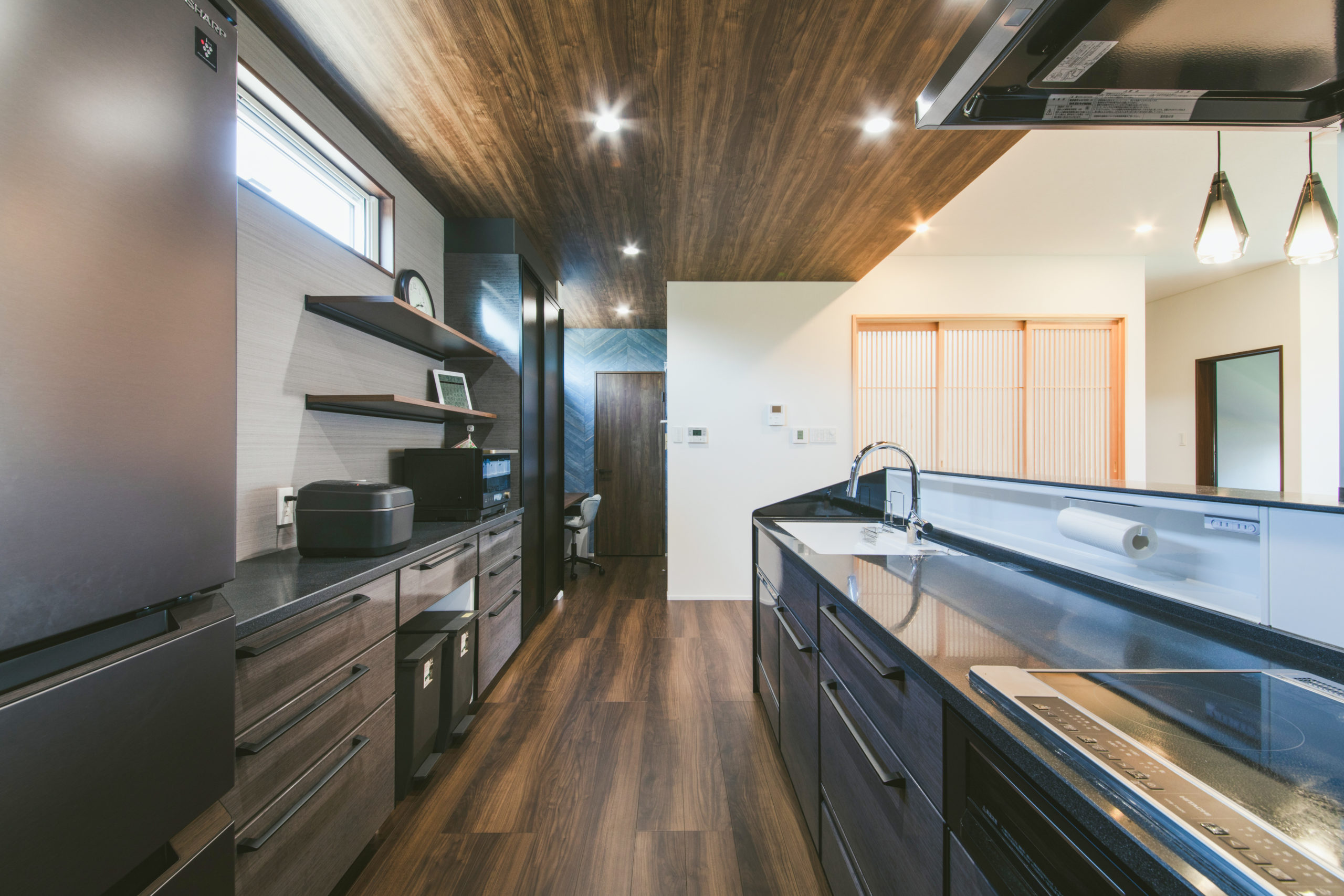 キッチンの家電や住設をブラック色でまとめ、天井と床の色を合わせることで、高級感ある空間になっています。