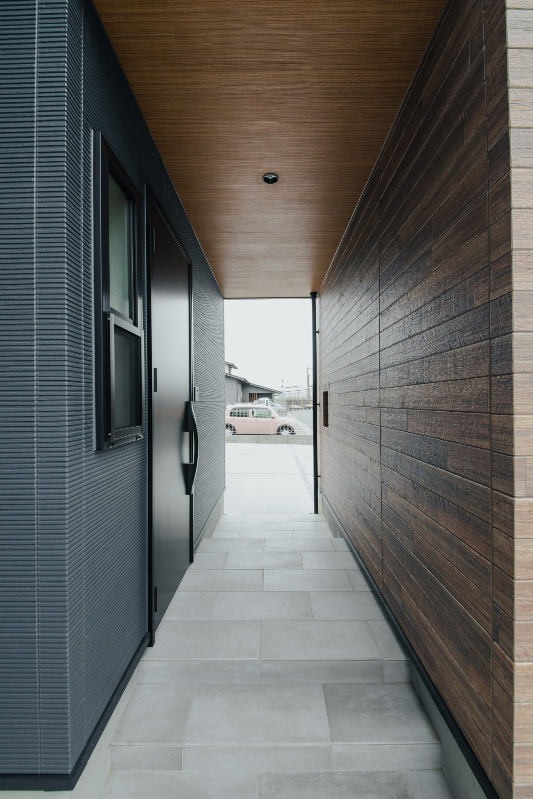 ブルーグレー系を基準色として、玄関前にはアクセントと玄関の目隠しを兼ねるウッド柄のアンバー系の壁。