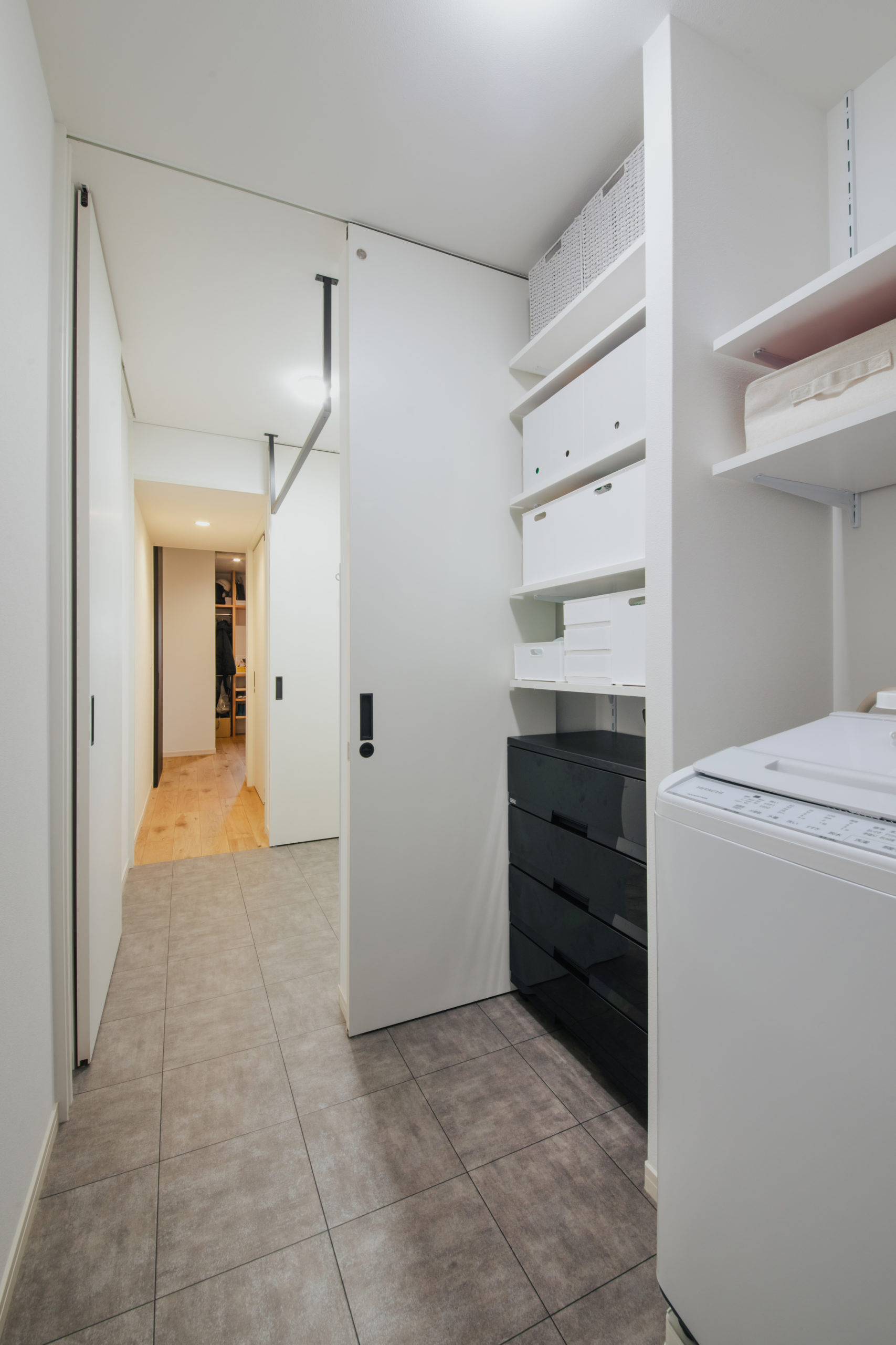 引き戸でつながる、洗濯機空間と室内物干し空間