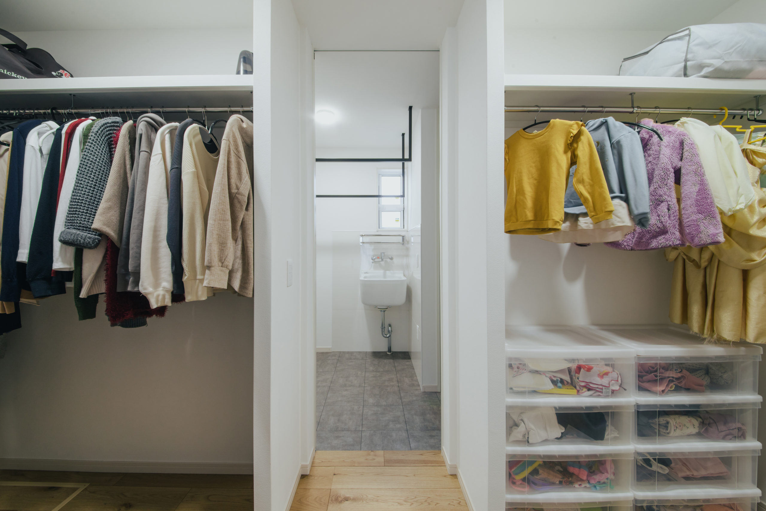 ファミリークロークから、室内物干し空間に繋がる