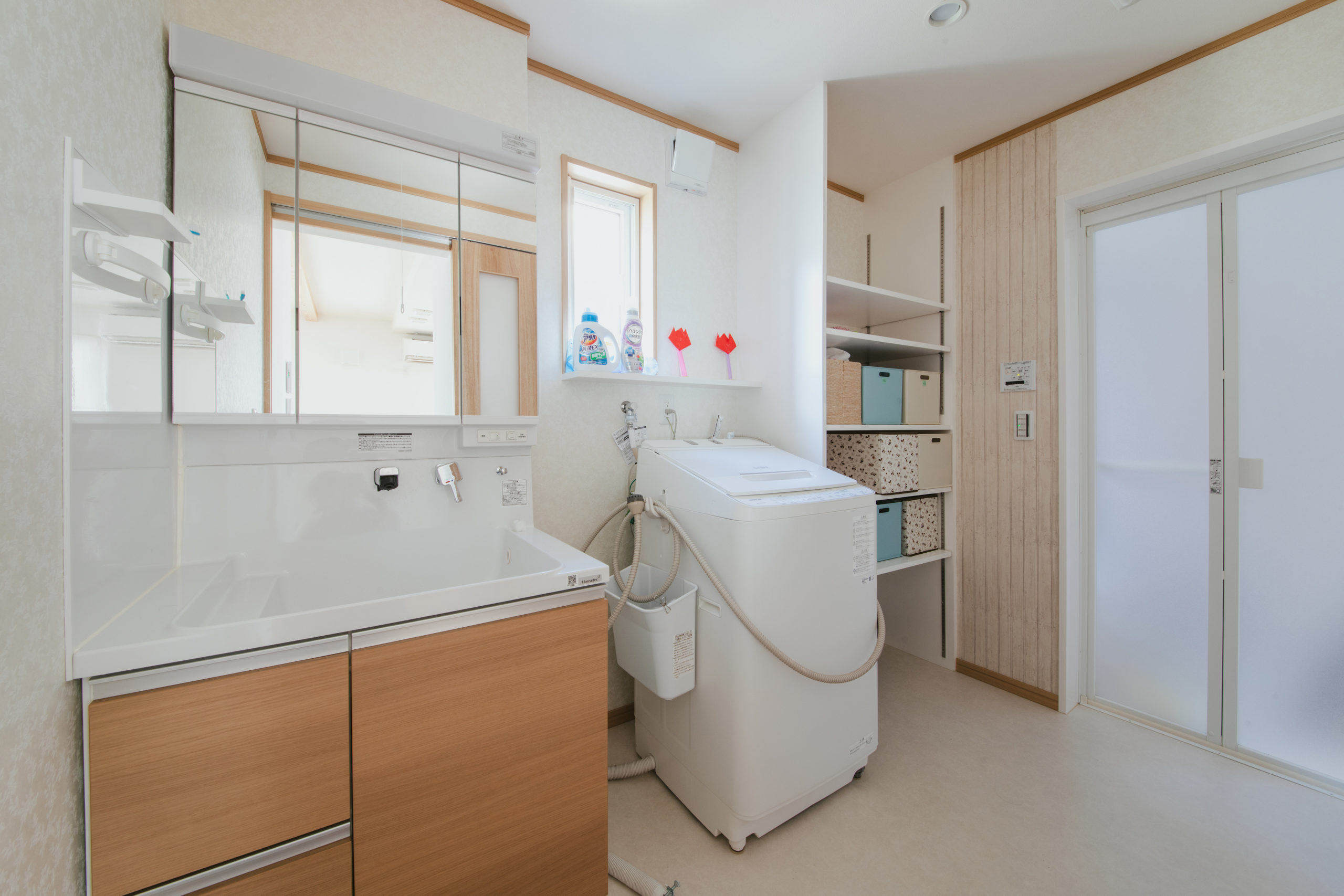 広々とした脱衣所。大きな空間で洗面台や洗濯機も、容易に配置することができ、衣服などの収納場所もしっかりと確保。