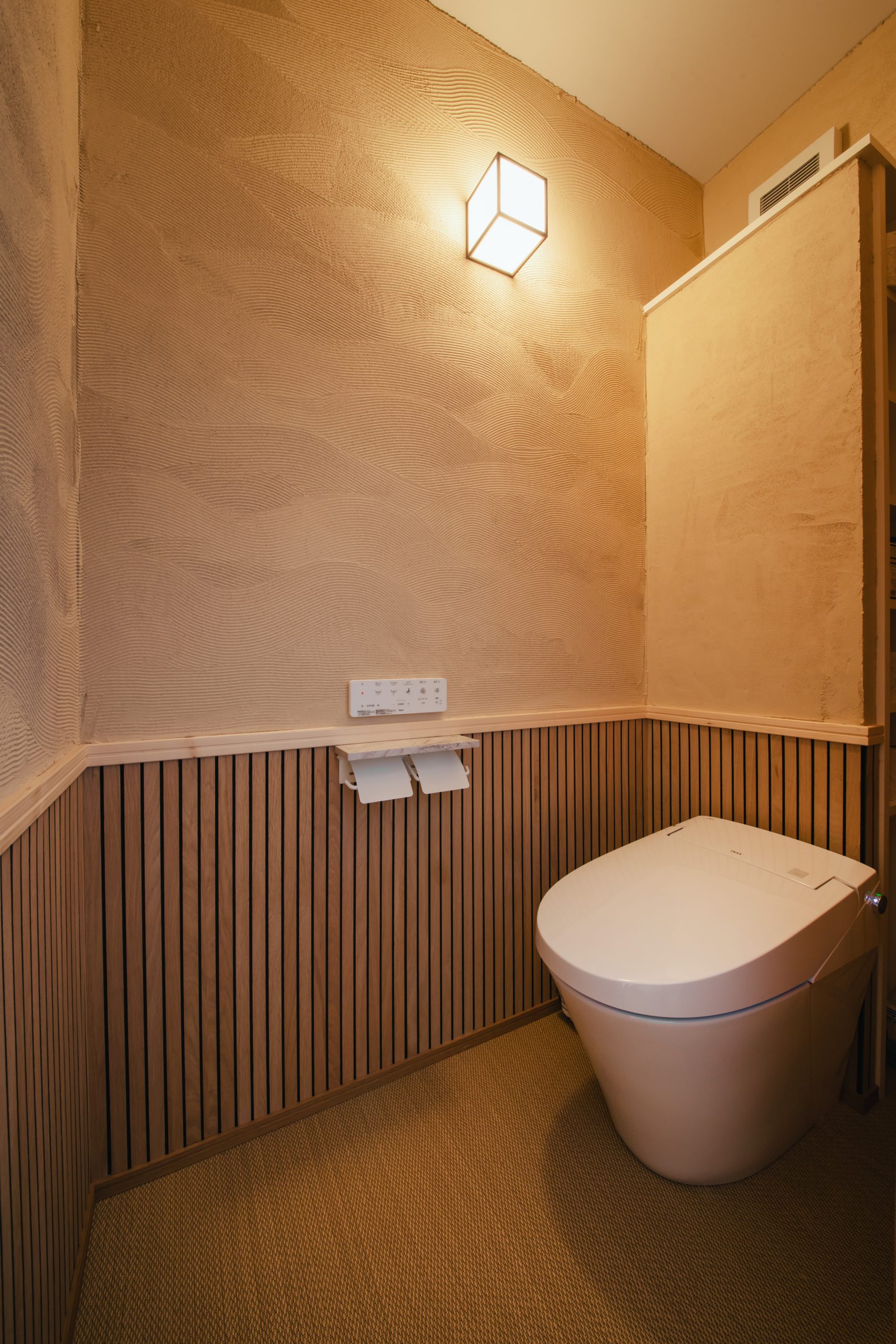 珪藻土の質感と、無垢格子の腰壁が調和した上質感のあるトイレ。