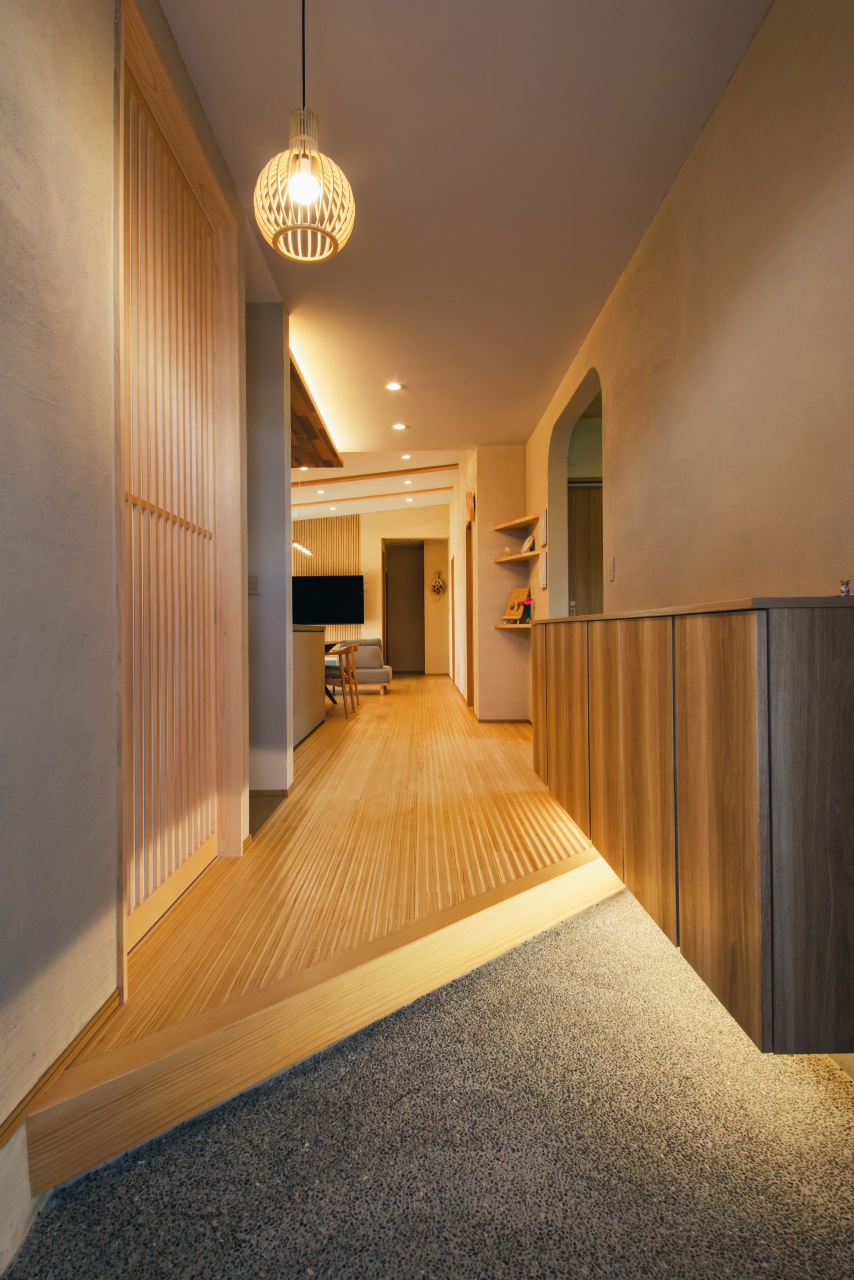 暖色系の照明に加え地窓で自然光を取り込み、落ち着きと暖かさを兼ね備えた安心できる空間に。